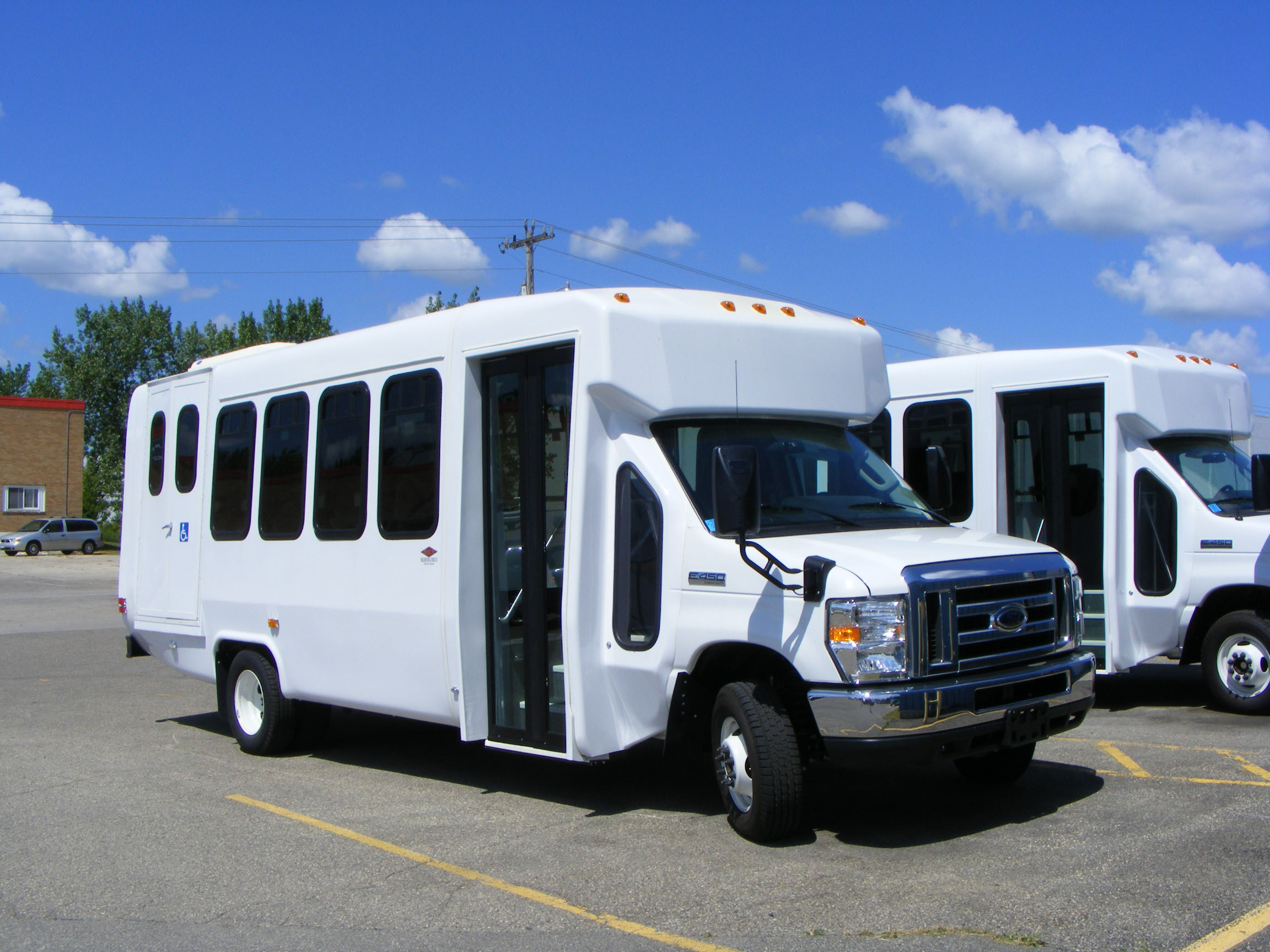 These new unlettered, unregistered and unnumbered Ford E450 buses were clearly new fleet replacements. Cutaway conversion is thought to be Diamond VIP 2500.
