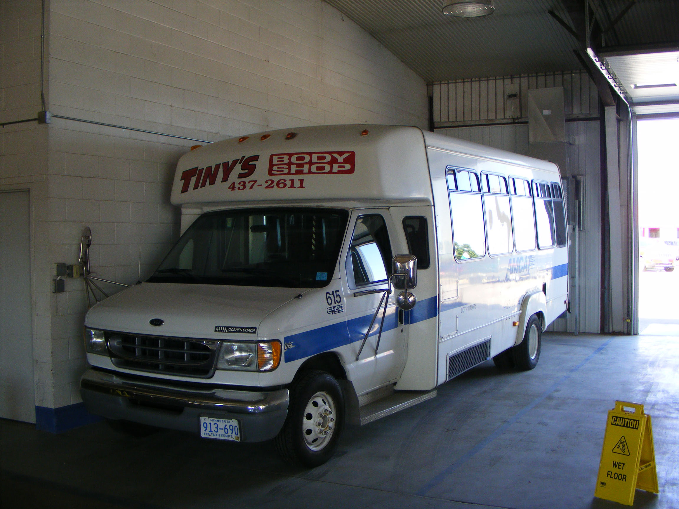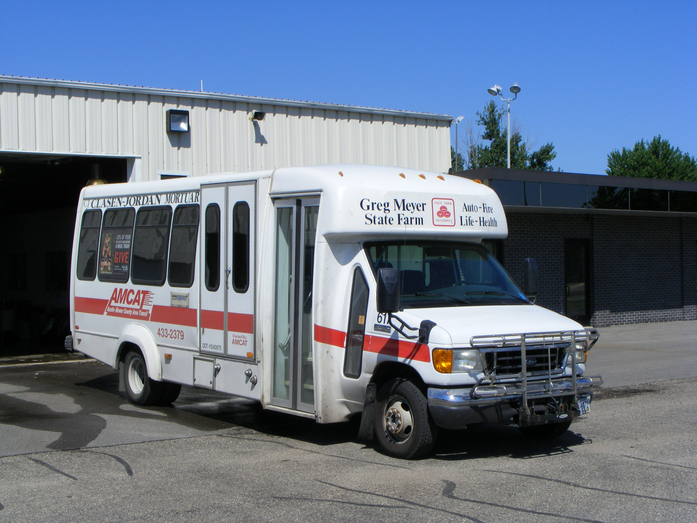 The AMCAT depot was visited in August 2011, since then Austin-Mower County Area Transit has merged with Albert Lea Transit and moved into their depot. Typical of the fleet was this Ford E450 finished in white and red outside the then depot. It is sign written with adverts for the local mortuary and an insurance company. |